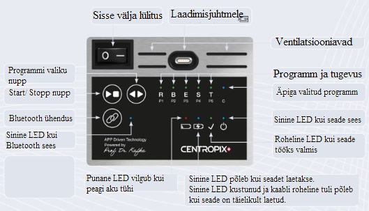 Centropix KLOUD mati juhtpaneeli on väga lihtne kasutada. P1-P5 näitavad programme. Äpi kasutamise puhul, peab Bluetooth nuppu vajutama. Sinine LED näitab valmidust ühenduse loomiseks. Vaikimisi on kõikide programmide intensiivsus 50% ehk tase 3 kuni pole ise muudetud. Tugevam intensiivsus ei tähenda alati kiiremat tulemust. Tuleb jälgida enesetunnet.